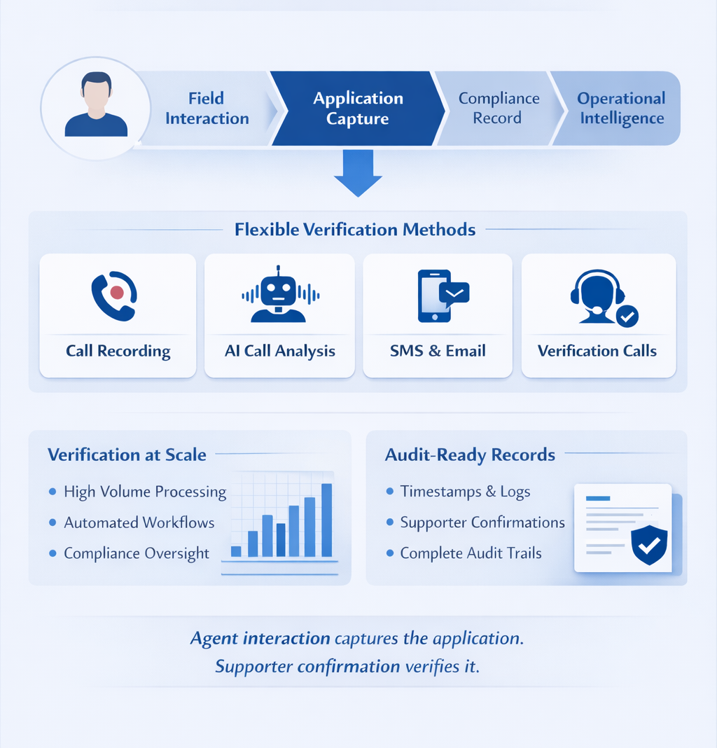 Verification ensures every application captured in the field is independently confirmed, supporter consent is validated, and campaign registrations remain fully compliant and audit-ready.